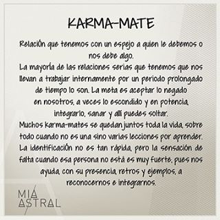 Karma-mate: relación que tenemos con un espejo a quien le debemos o nos debe algo. La mayoría de las relaciones serias que tenemos, que nos llevan a trabajar internamente por un período prolongado lo son. La clave es aceptar lo negado, lo escondido en nosotros e integrarlo, para sanar y poder soltar.