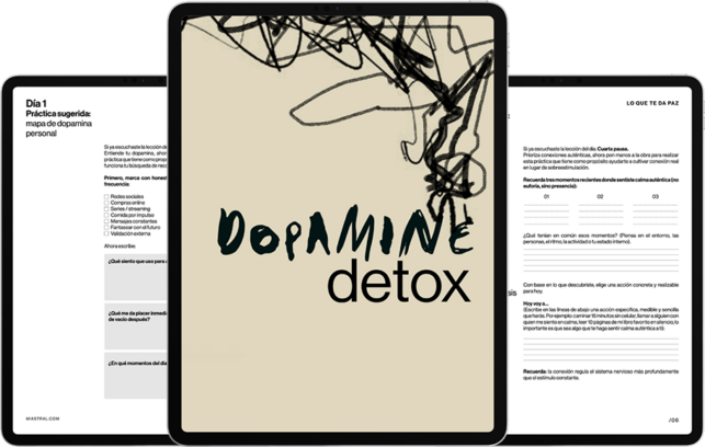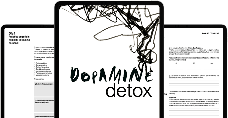 Para profundizar esta pausa y llevarla a la práctica con ejercicios guiados, acompaña este proceso con el workbook del Dopamine Detox.